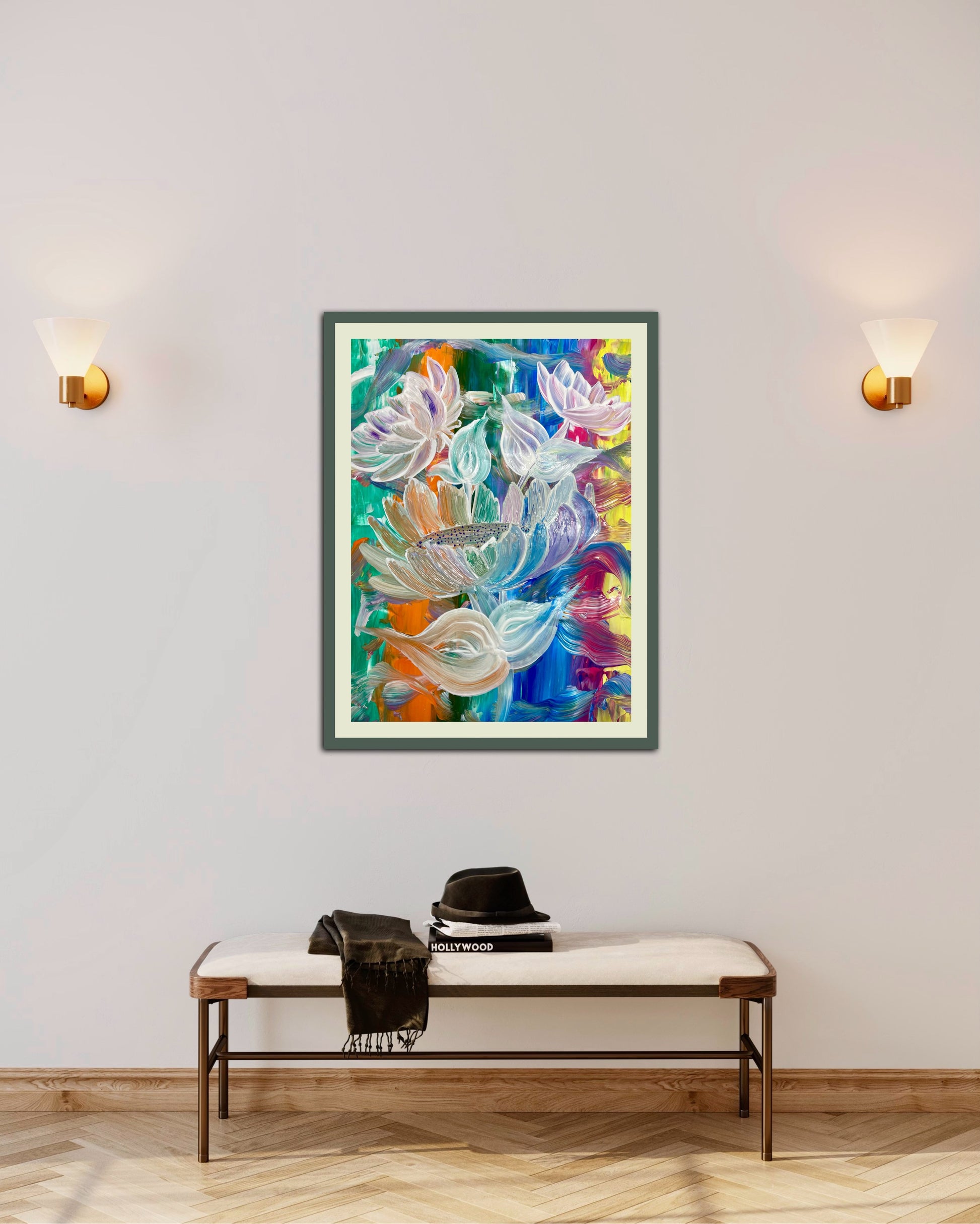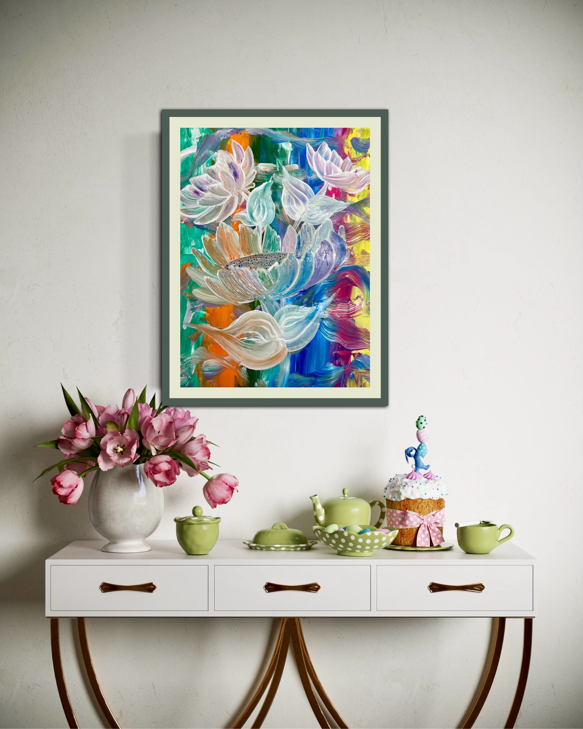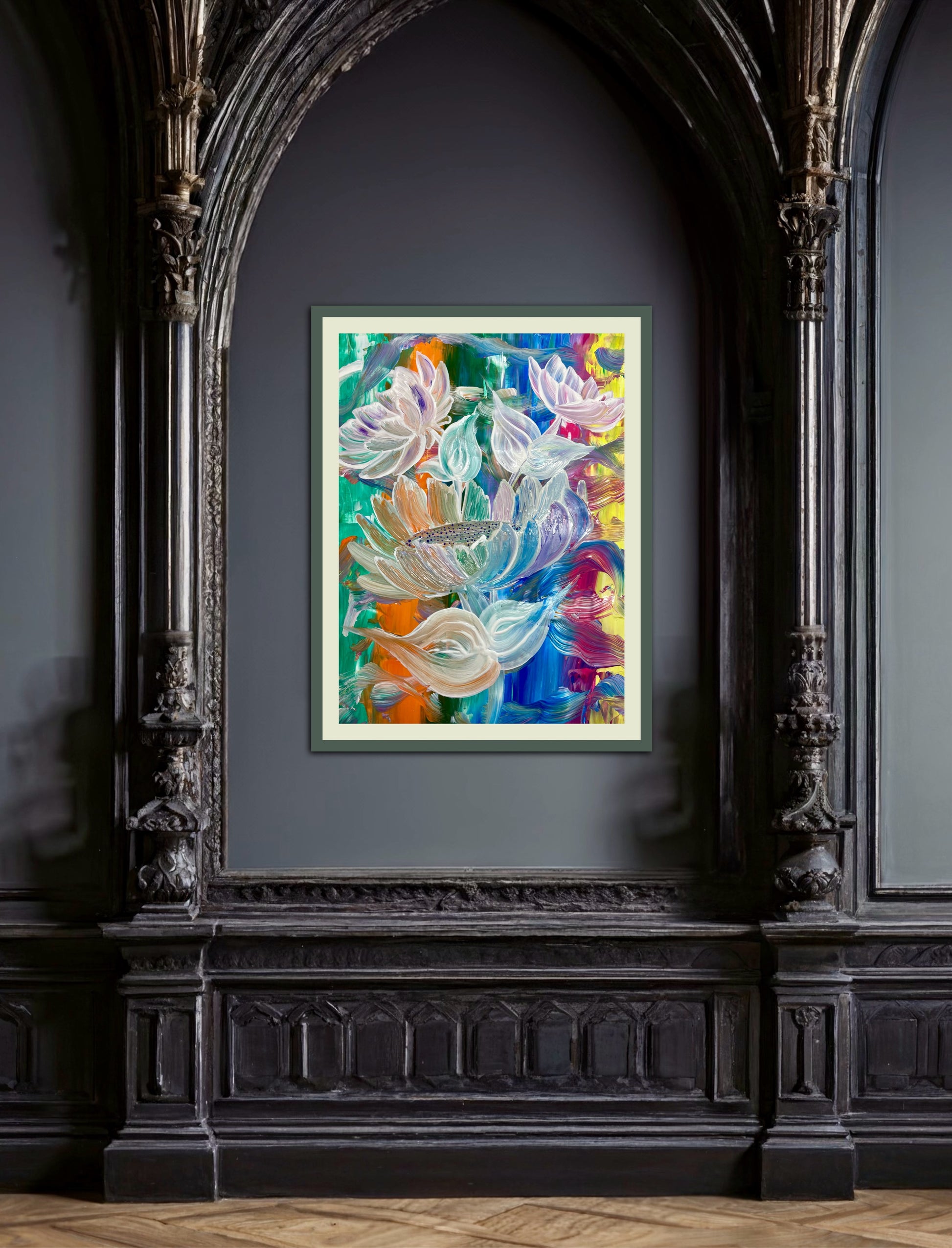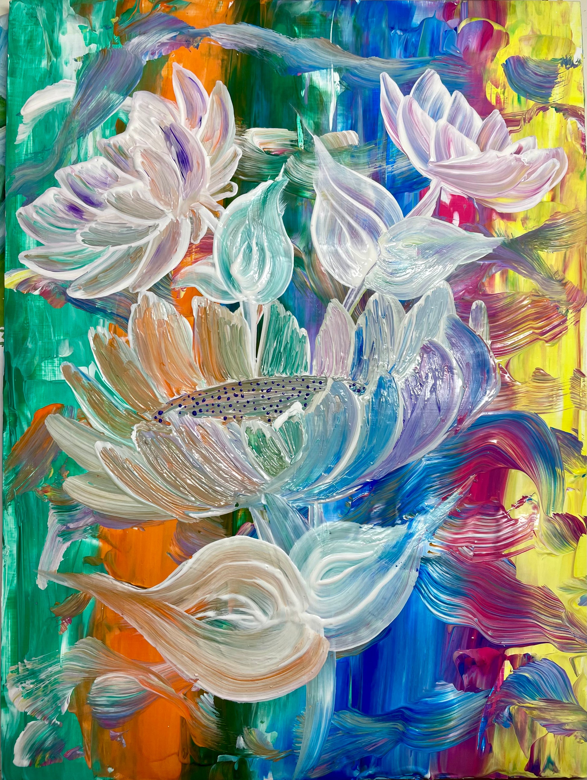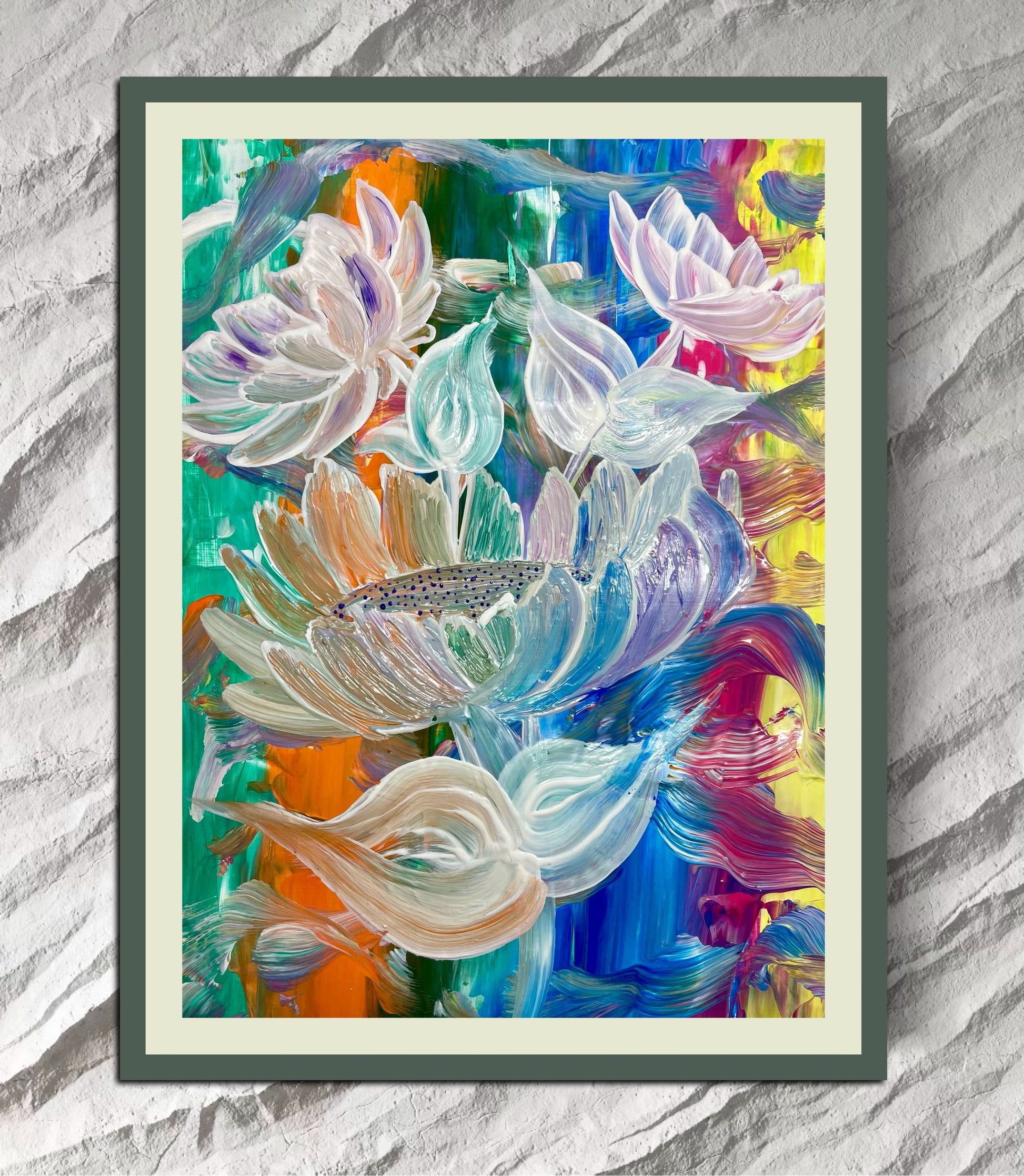 „Dieses Bild spiegelt meine Wahrnehmung der Lebendigkeit und Schönheit der Natur wider. Die kräftigen Farben stehen für die Intensität und das Chaos des Lebens, während die weißen Blüten Momente der Klarheit und Ruhe symbolisieren. Beim Malen ließ ich mich von meinen Emotionen leiten, wodurch ein Werk entstand, das Bewegung, Freude und Harmonie vereint. Ich hoffe, es inspiriert, die kleinen Wunder im Alltag zu erkennen."