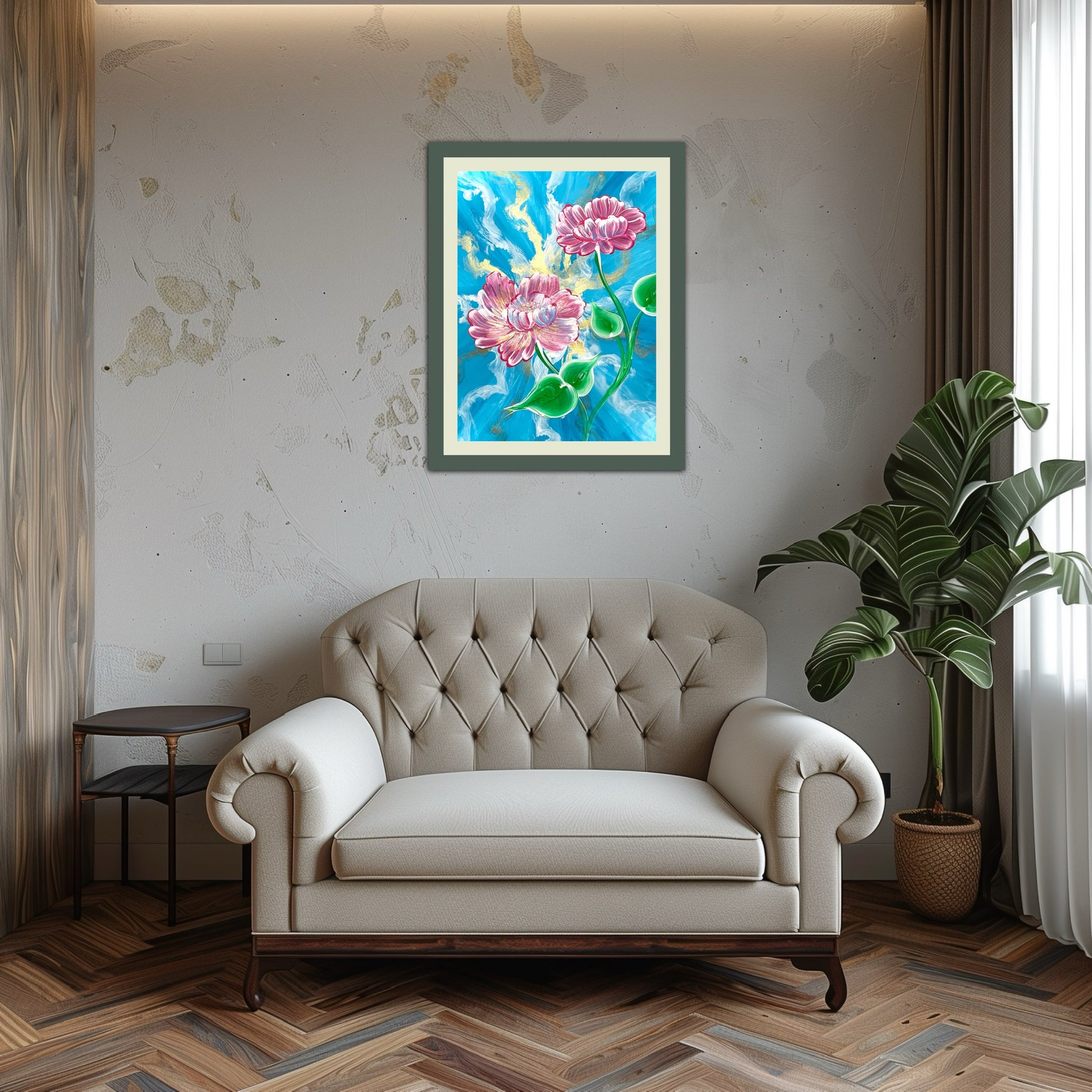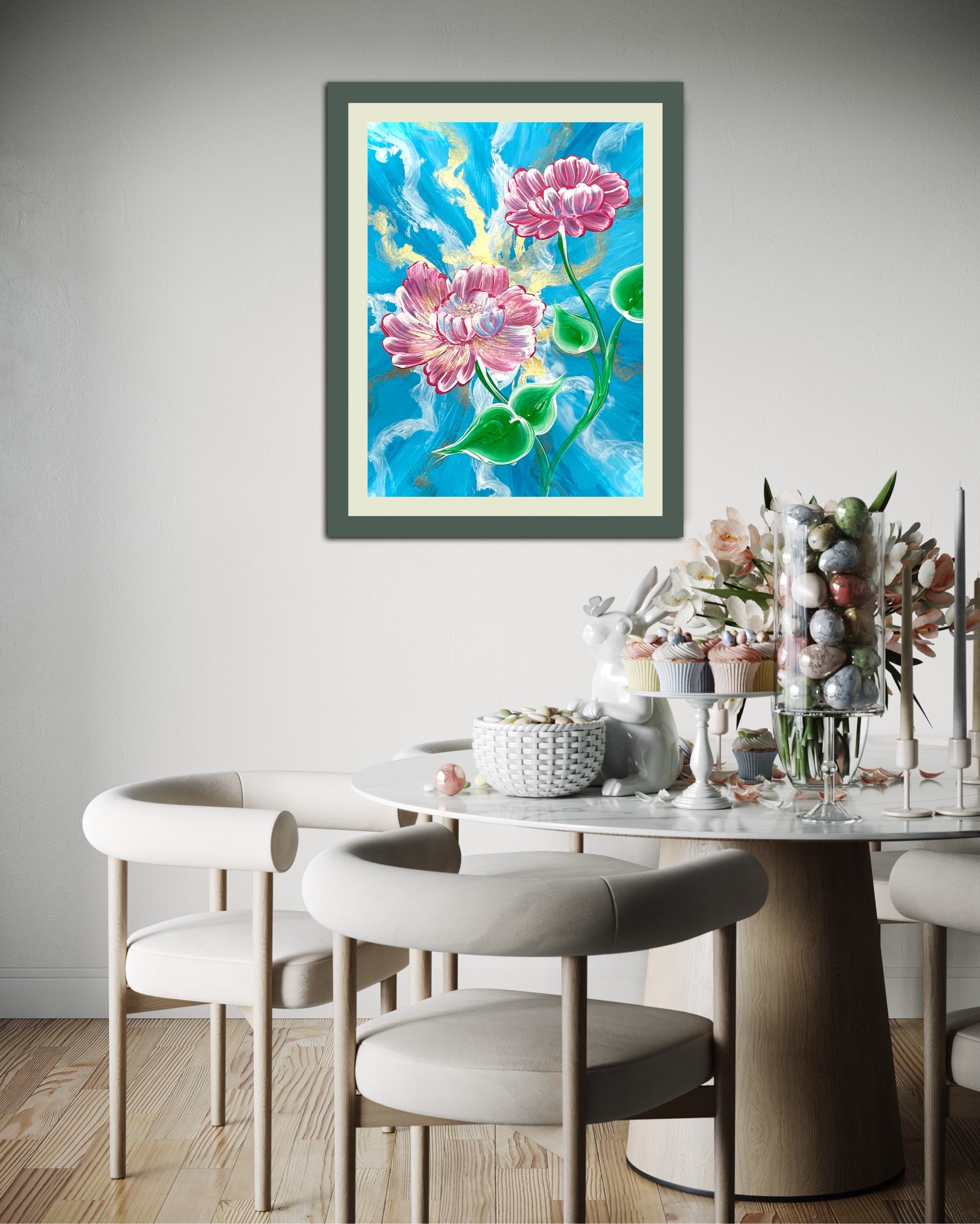 Mit diesem Bild wollte ich die Verbindung zwischen der Lebendigkeit der Natur und der Leichtigkeit des Himmels zeigen. Die Blüten stehen für Wachstum und Zerbrechlichkeit, während der Hintergrund mit seinen goldenen und weißen Akzenten die Energie und das Licht darstellt, die uns umgeben.