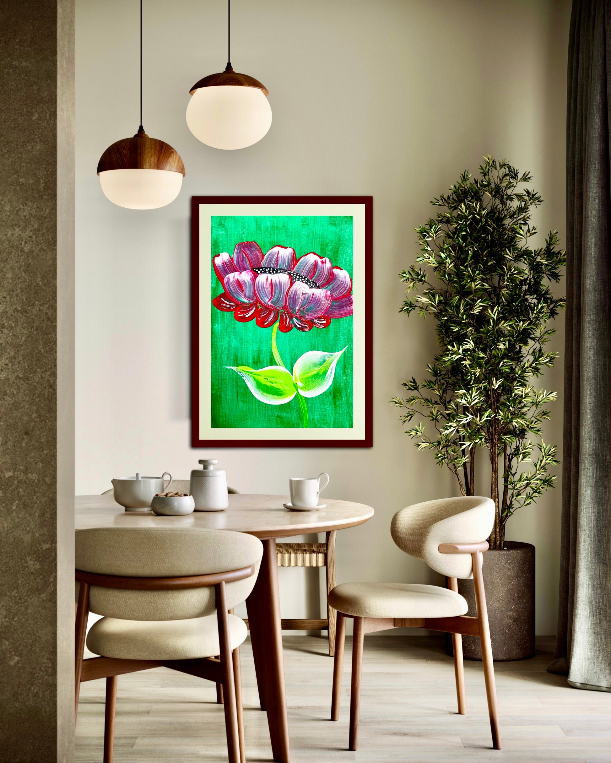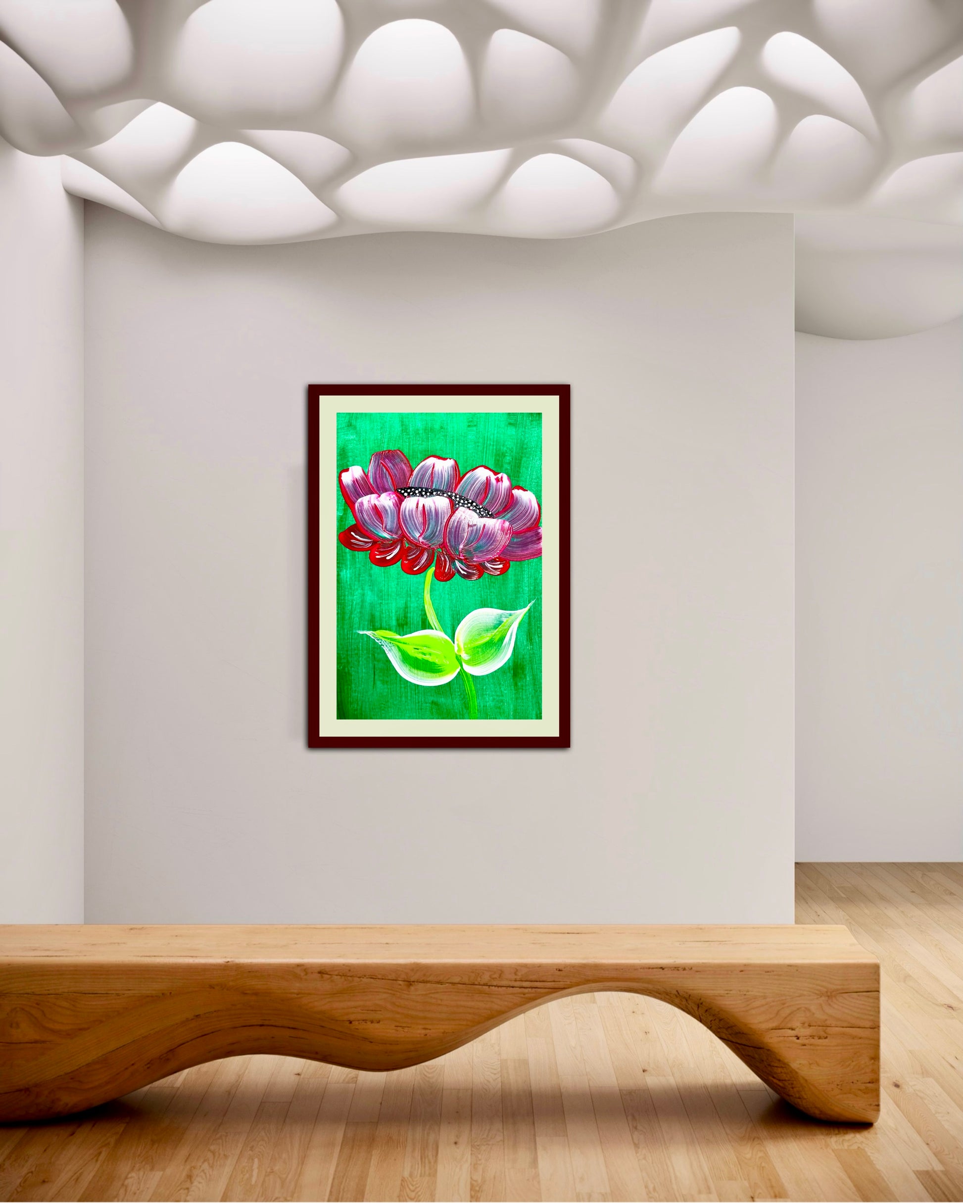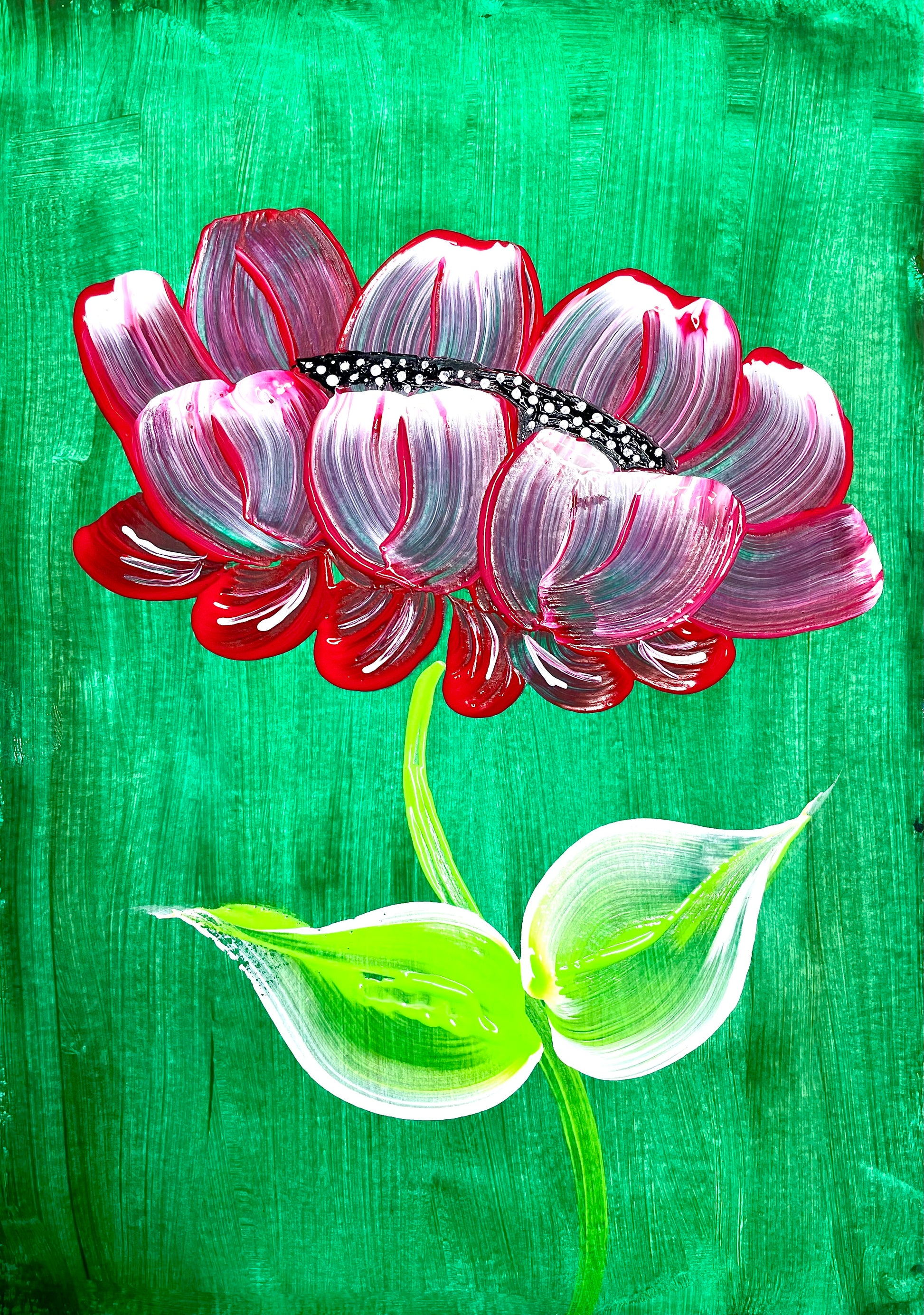 Ich wollte die Stärke und Zerbrechlichkeit zugleich zeigen – wie sich eine Blume voller Stolz öffnet, ihre Farben strahlen lässt, obwohl sie so zart ist. Jeder Pinselstrich war wie ein Atemzug, ein Versuch, den Moment einzufangen, in dem sie lebendig wird. Der grüne Hintergrund ist nicht nur Farbe, sondern ein Raum voller Hoffnung, Wachstum und Leben, der alles umgibt. Die Punkte im Inneren der Blume sind wie die Geheimnisse, die jeder von uns in sich trägt – unscheinbar, aber so bedeutungsvoll.