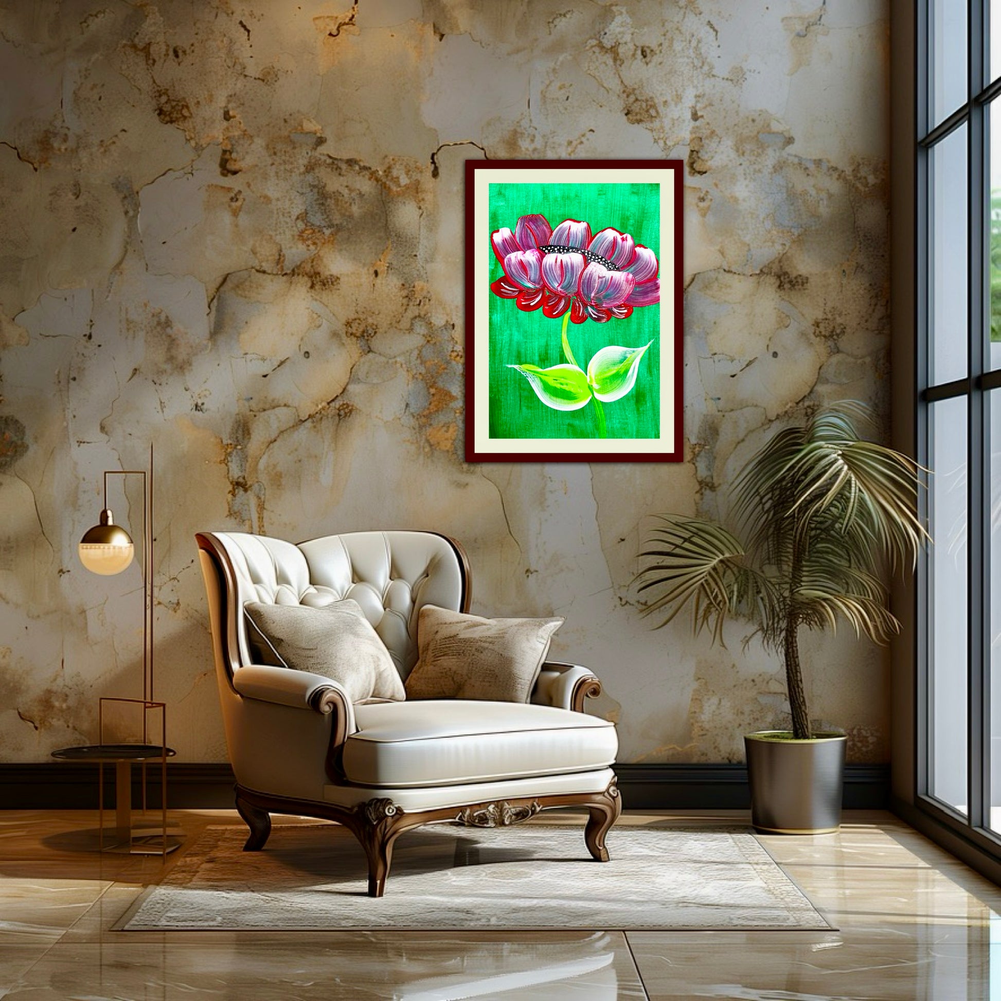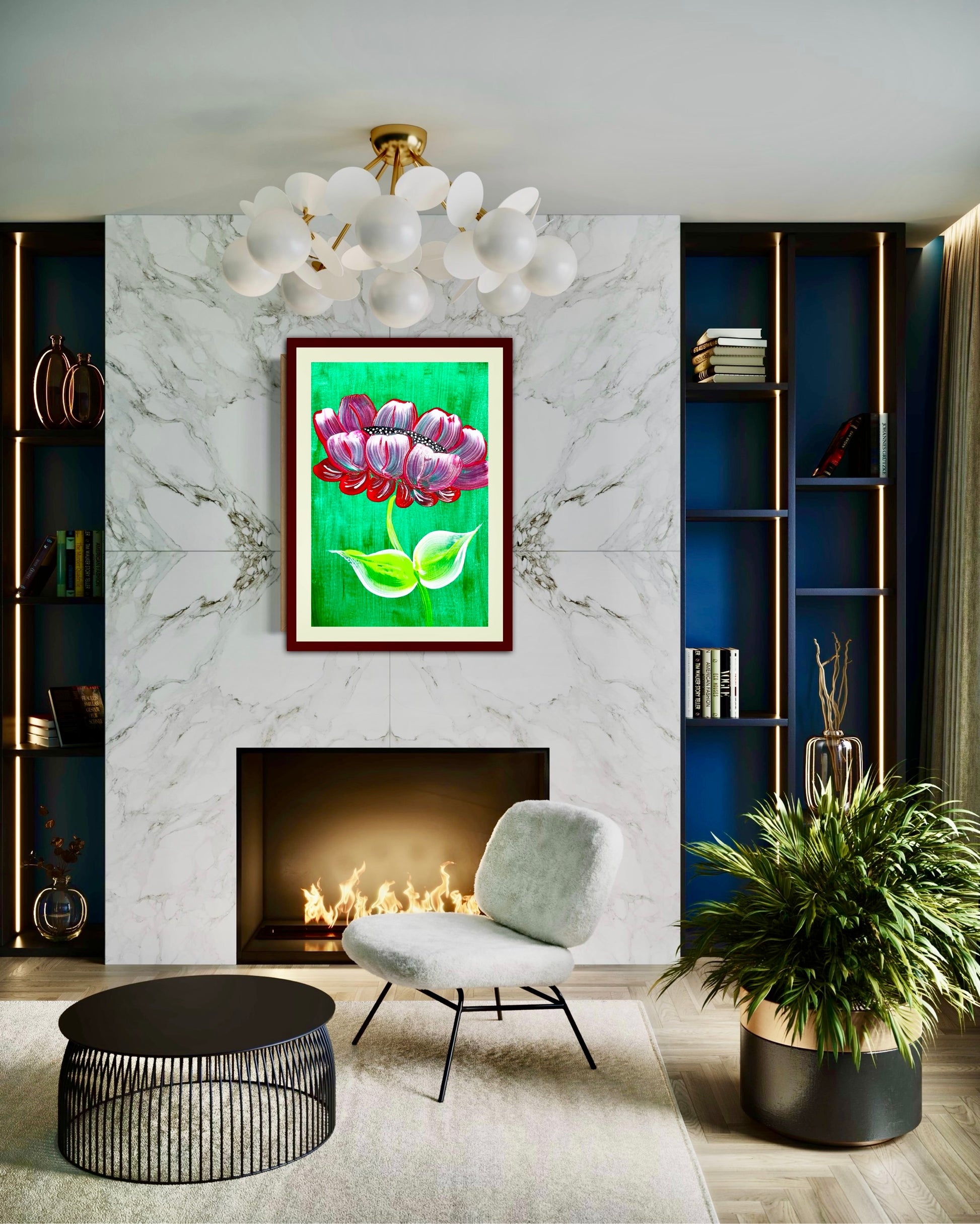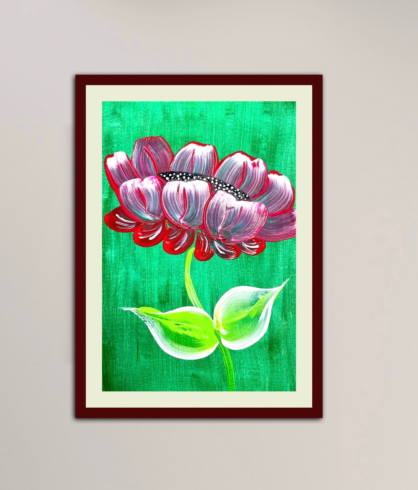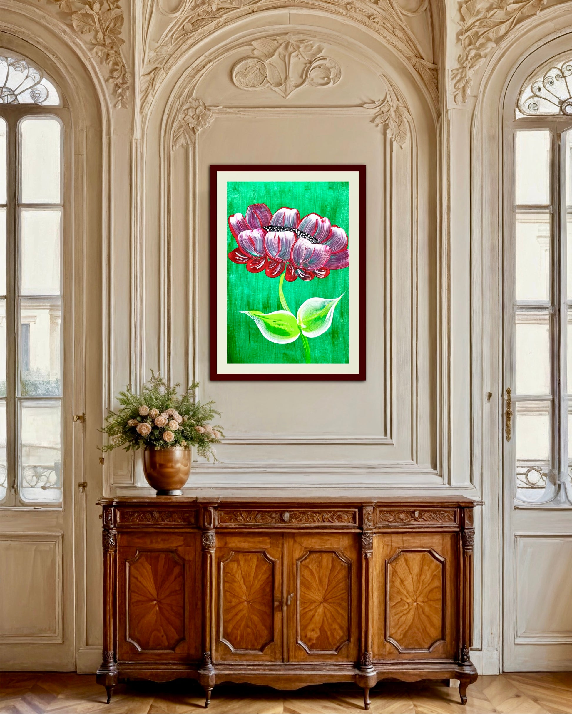 Ich wollte die Stärke und Zerbrechlichkeit zugleich zeigen – wie sich eine Blume voller Stolz öffnet, ihre Farben strahlen lässt, obwohl sie so zart ist. Jeder Pinselstrich war wie ein Atemzug, ein Versuch, den Moment einzufangen, in dem sie lebendig wird. Der grüne Hintergrund ist nicht nur Farbe, sondern ein Raum voller Hoffnung, Wachstum und Leben, der alles umgibt. Die Punkte im Inneren der Blume sind wie die Geheimnisse, die jeder von uns in sich trägt – unscheinbar, aber so bedeutungsvoll.