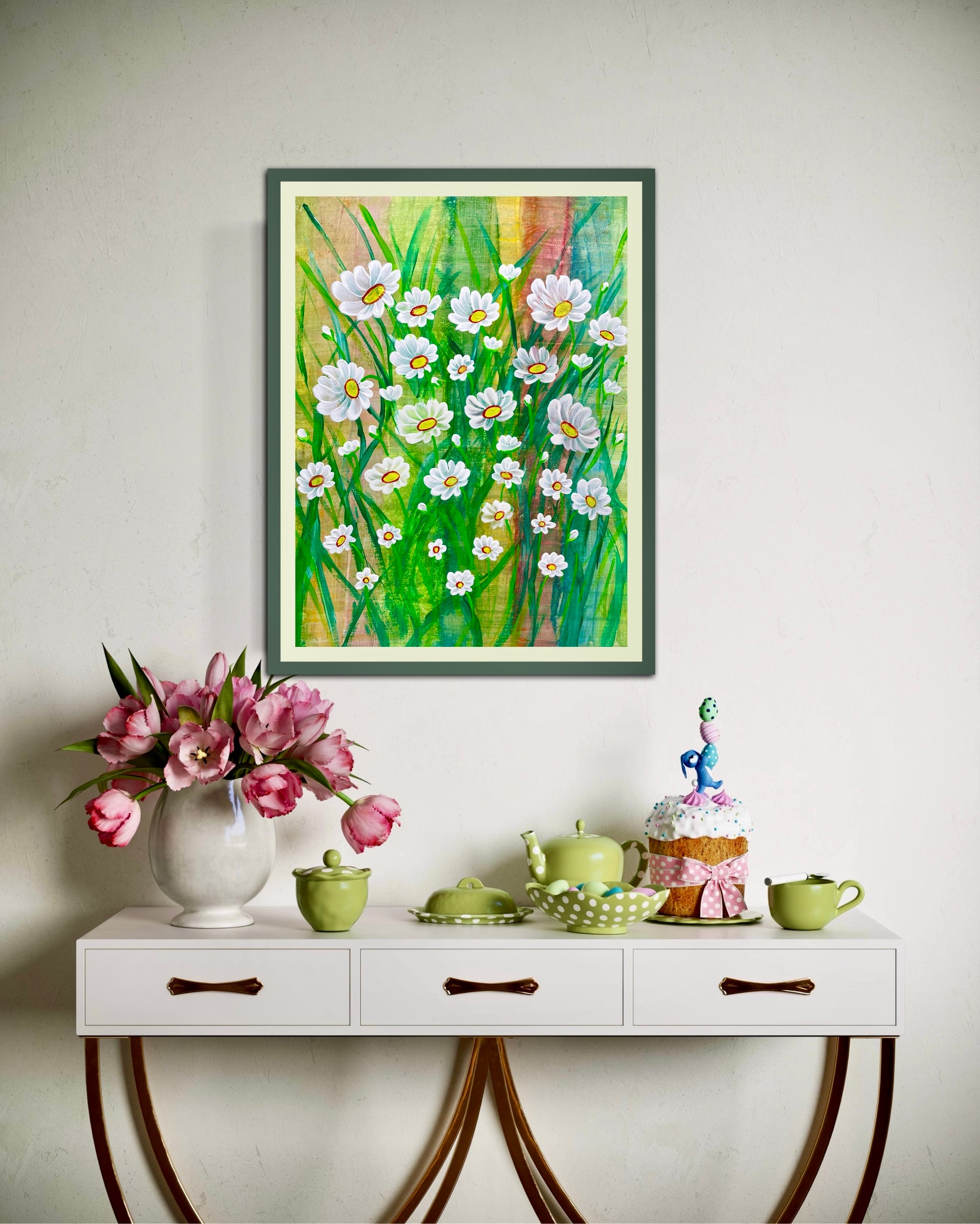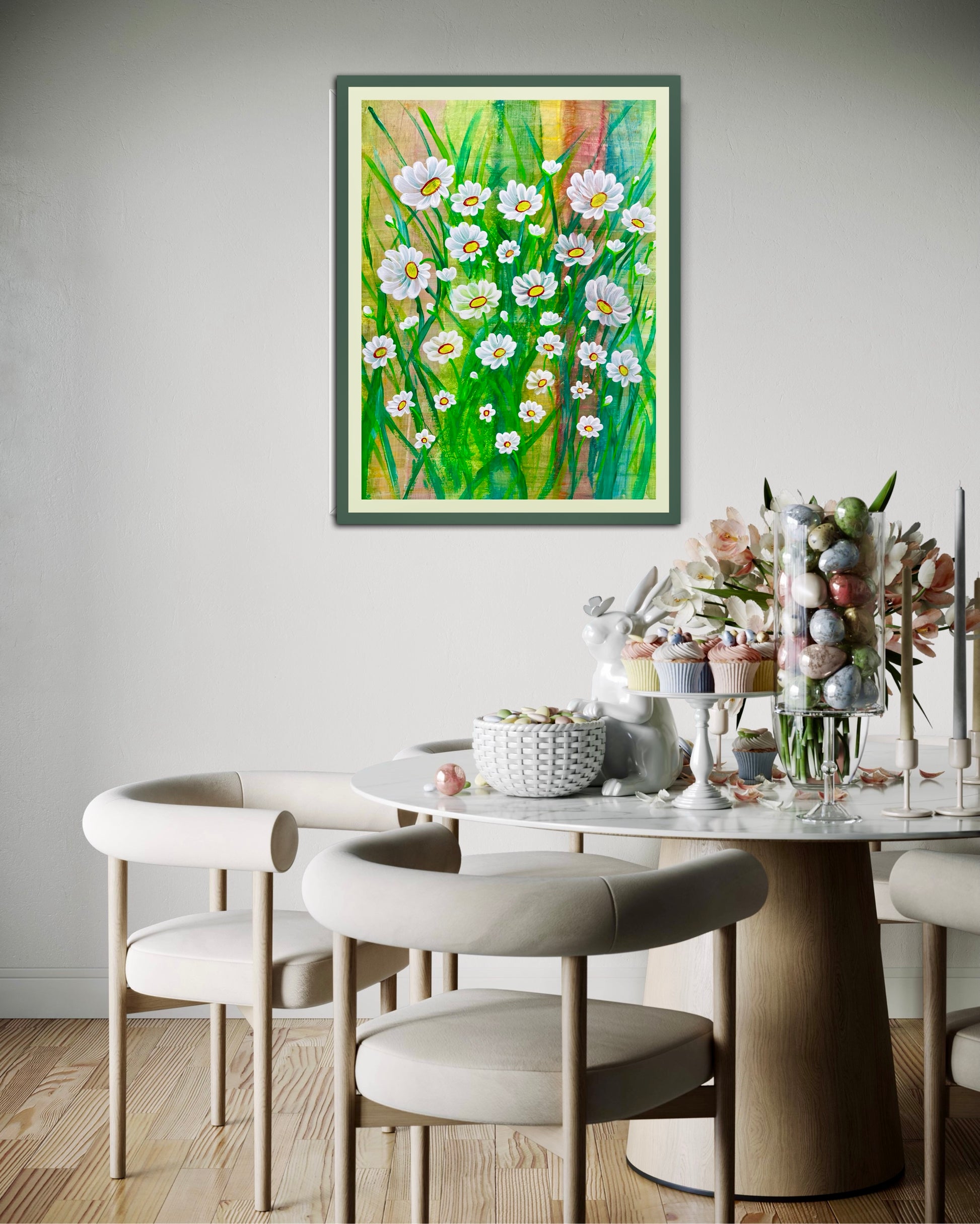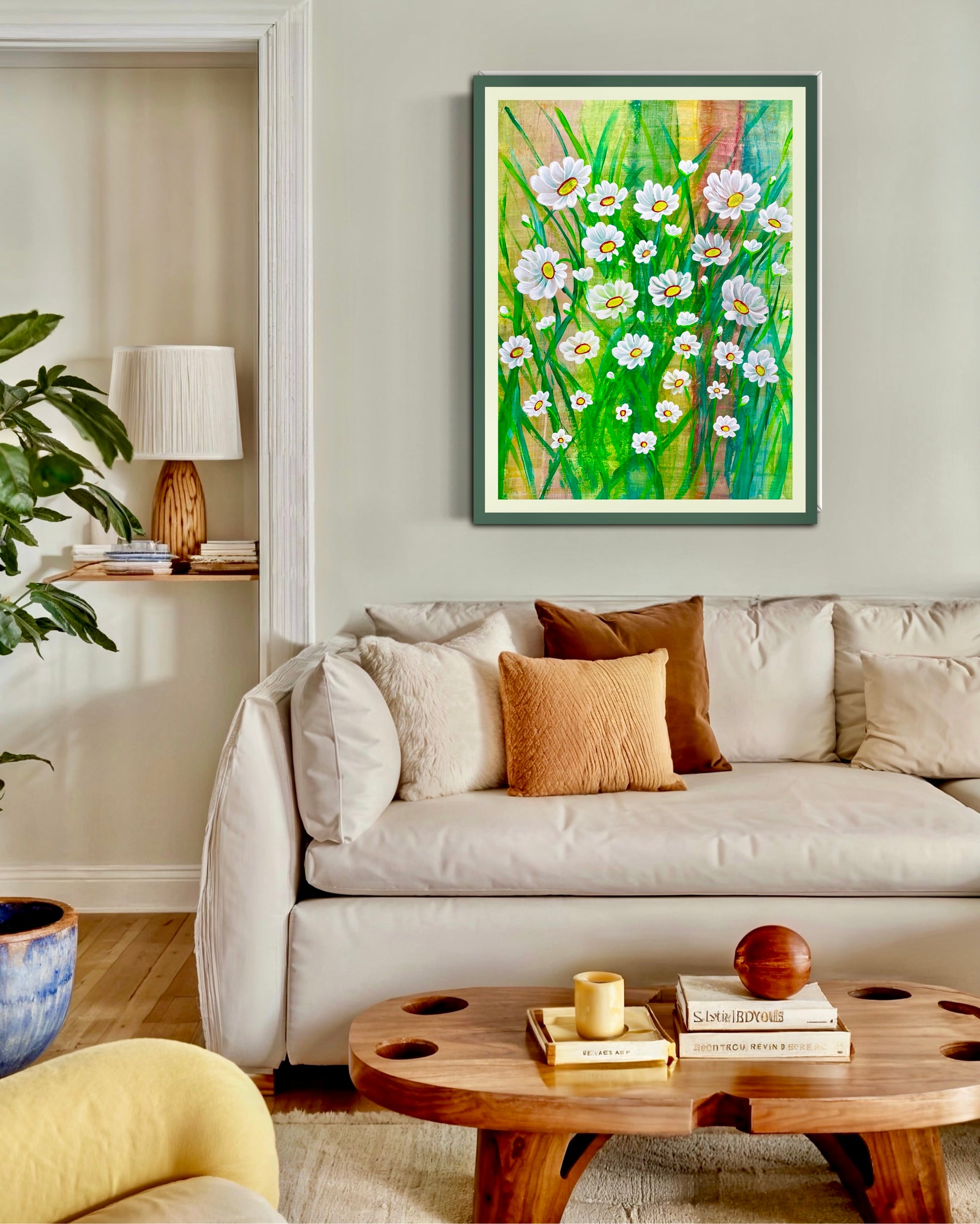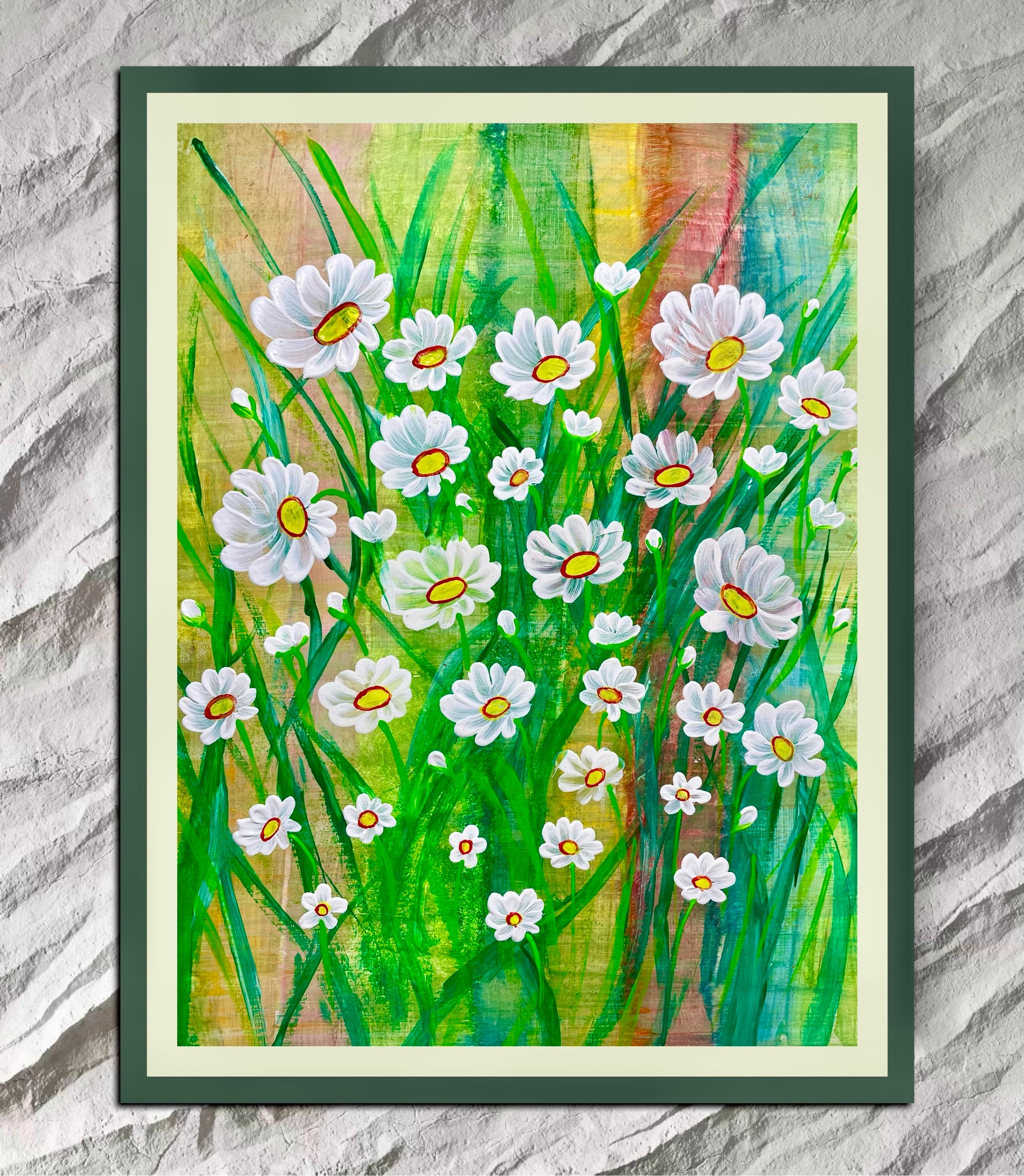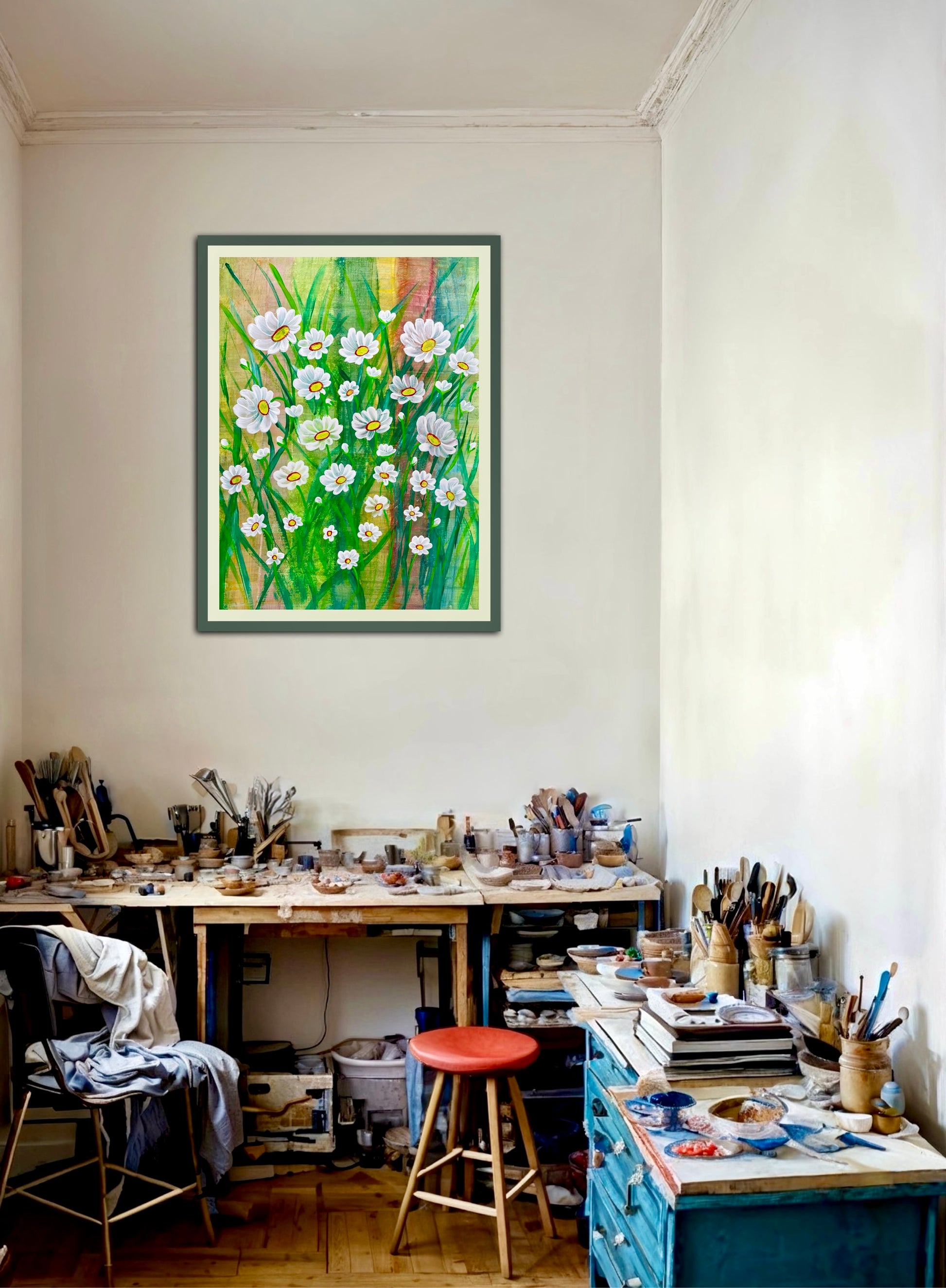 Die Gänseblümchen habe ich mit Liebe zum Detail gemalt, damit sie lebendig wirken – wie ein Tanz im sanften Wind. Die Gräser habe ich mit schnellen Pinselstrichen gestaltet, um Bewegung und Dynamik einzufangen.