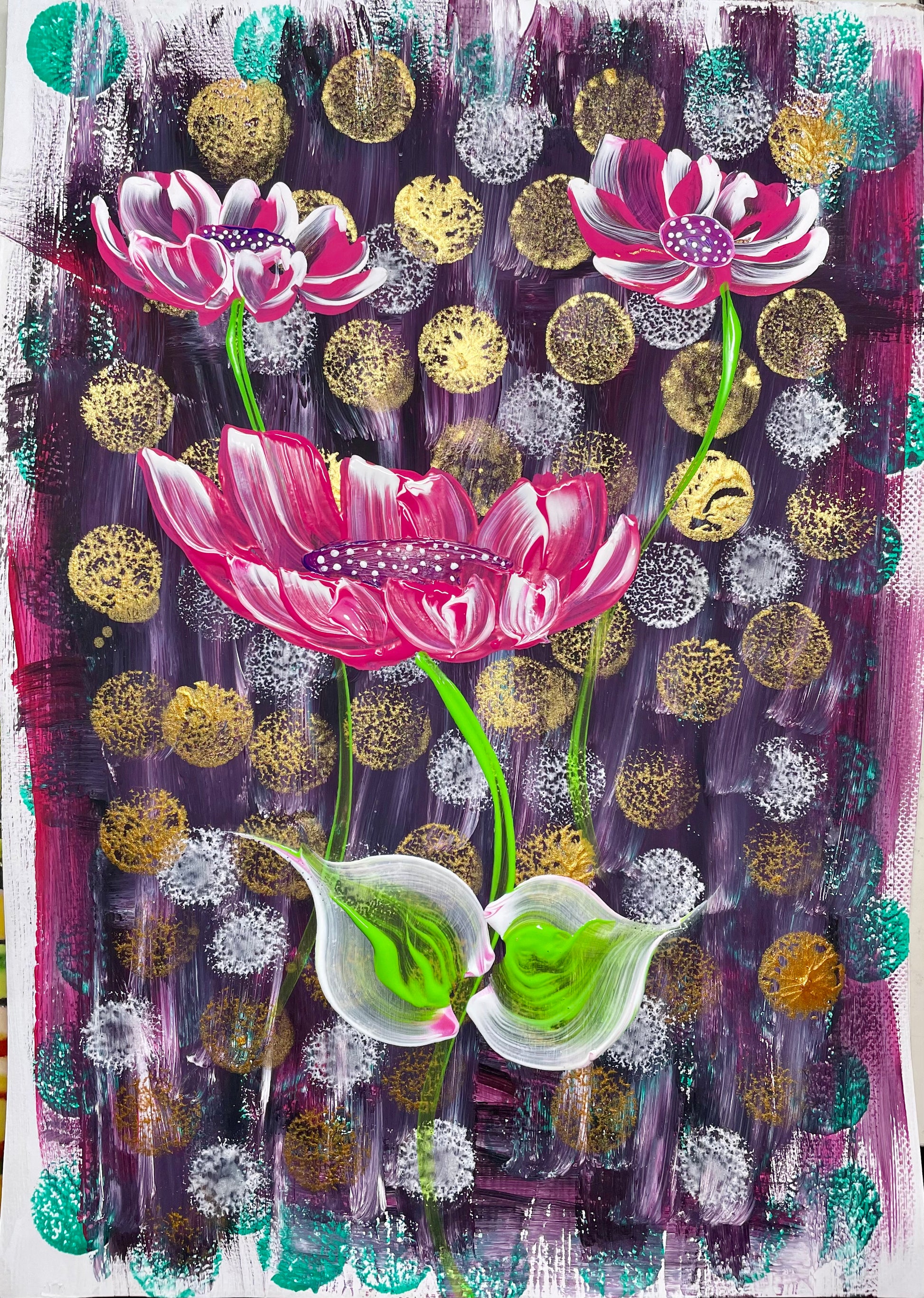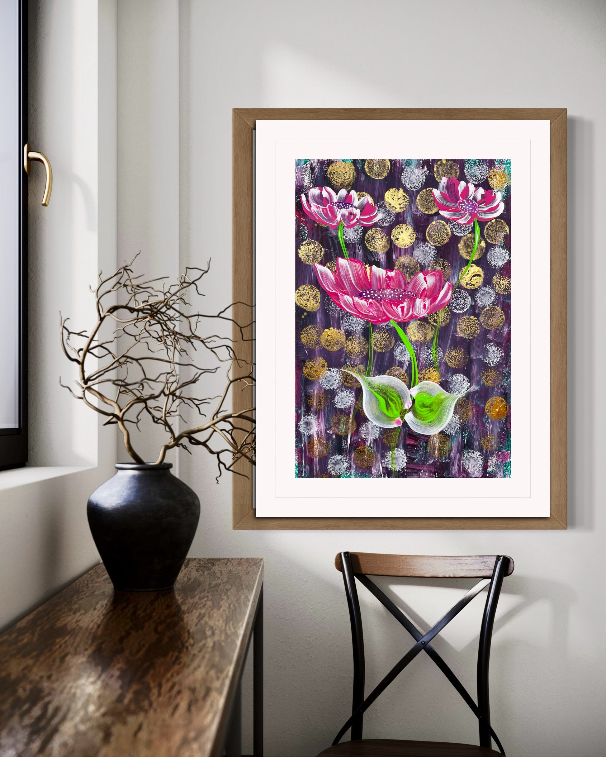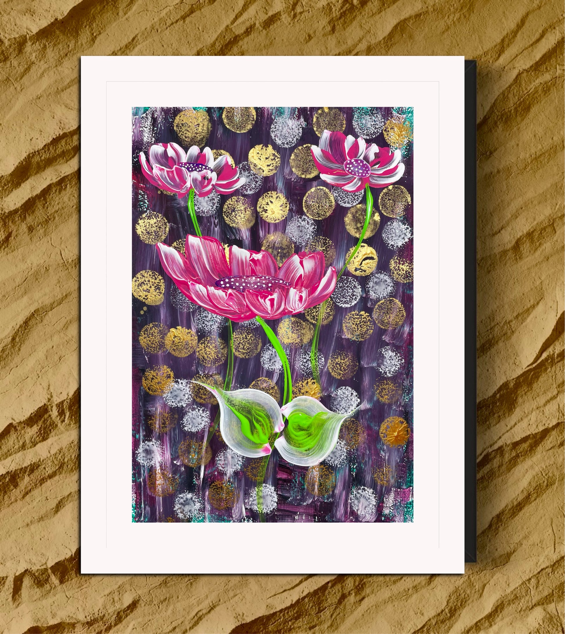Die Inspiration für dieses Werk kam von der Vorstellung, dass Schönheit und Wachstum oft mit Herausforderungen verbunden sind. Die rosafarbenen Blüten, die sich gegen den dunklen Hintergrund abheben, sollen Hoffnung und Transformation symbolisieren. Es spiegelt wider, dass das Leben sich selbst in schwierigen Momenten entfaltet.