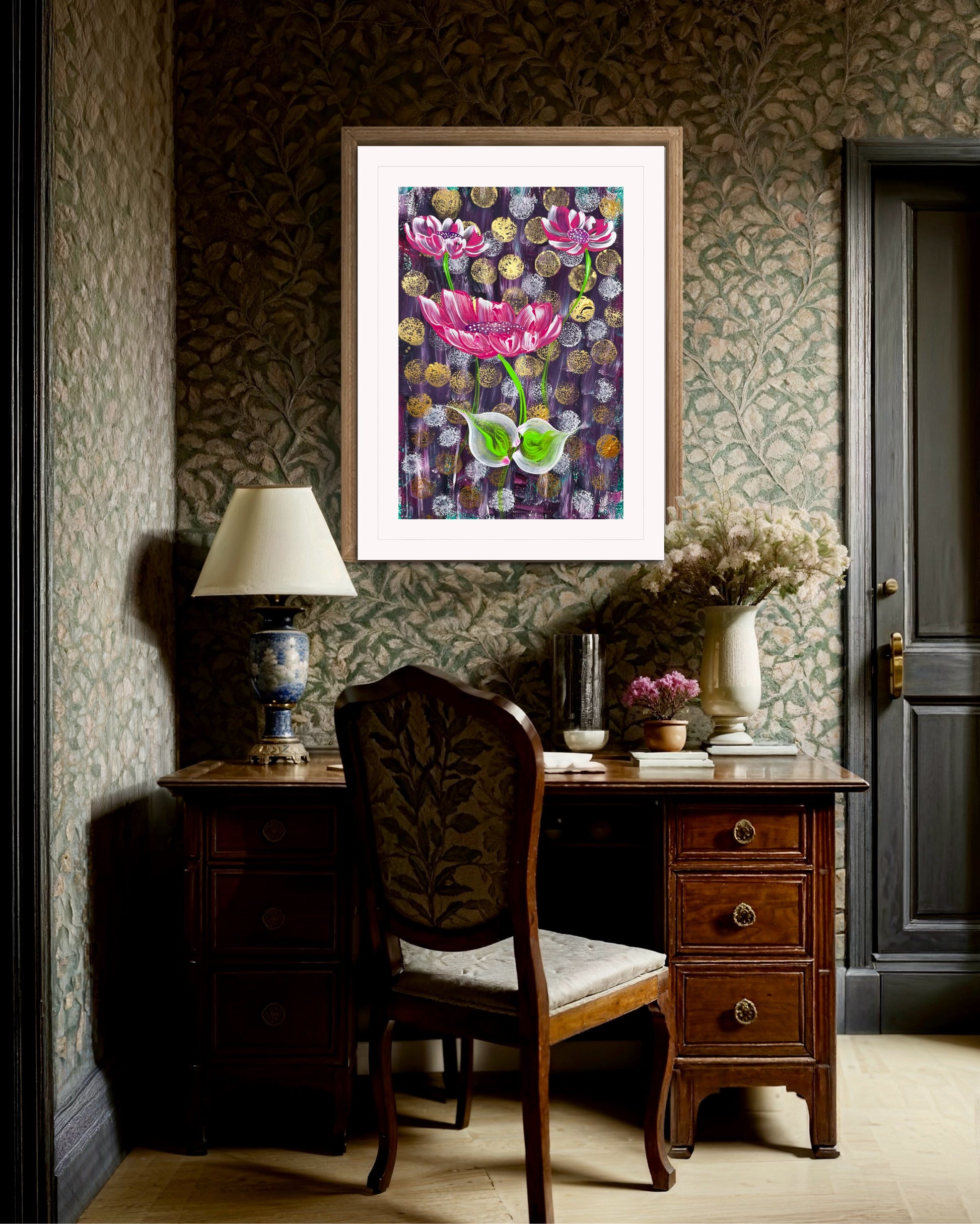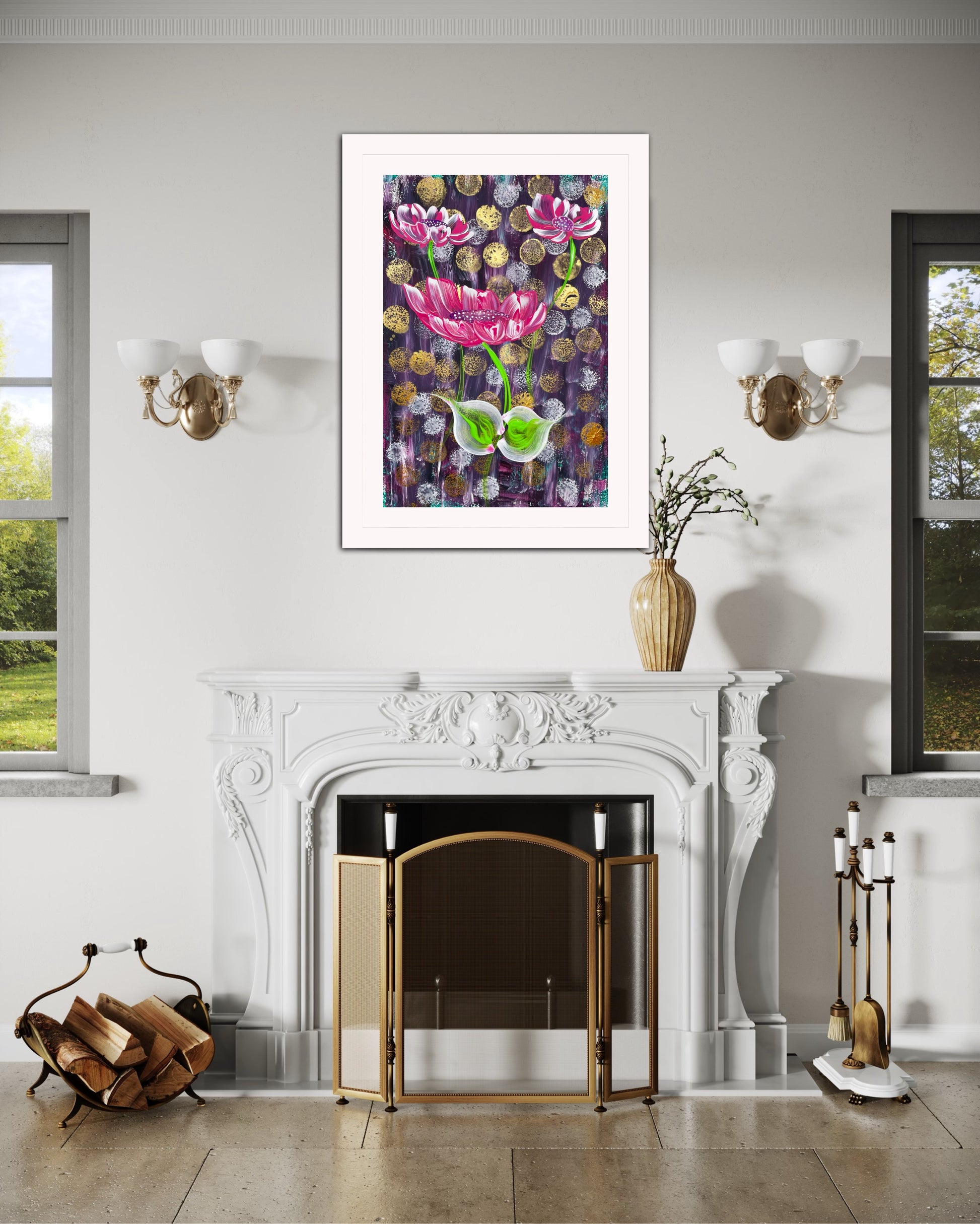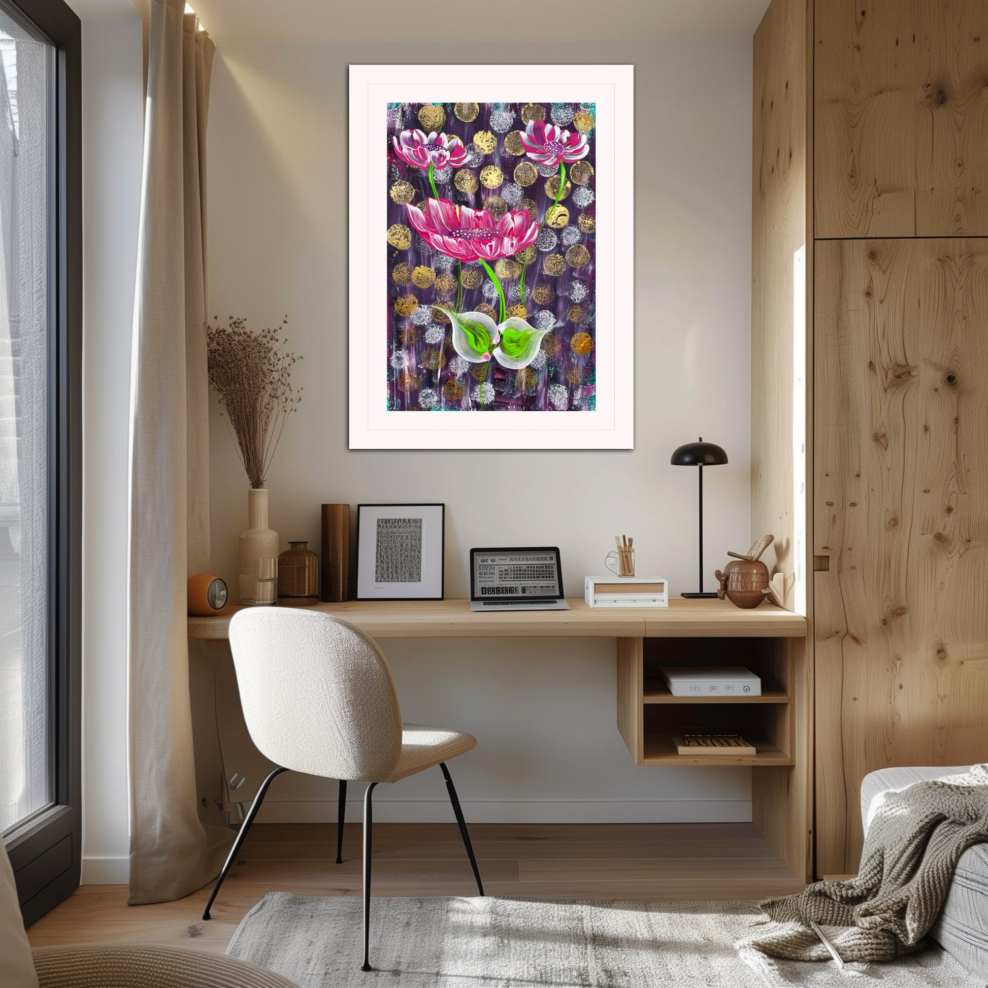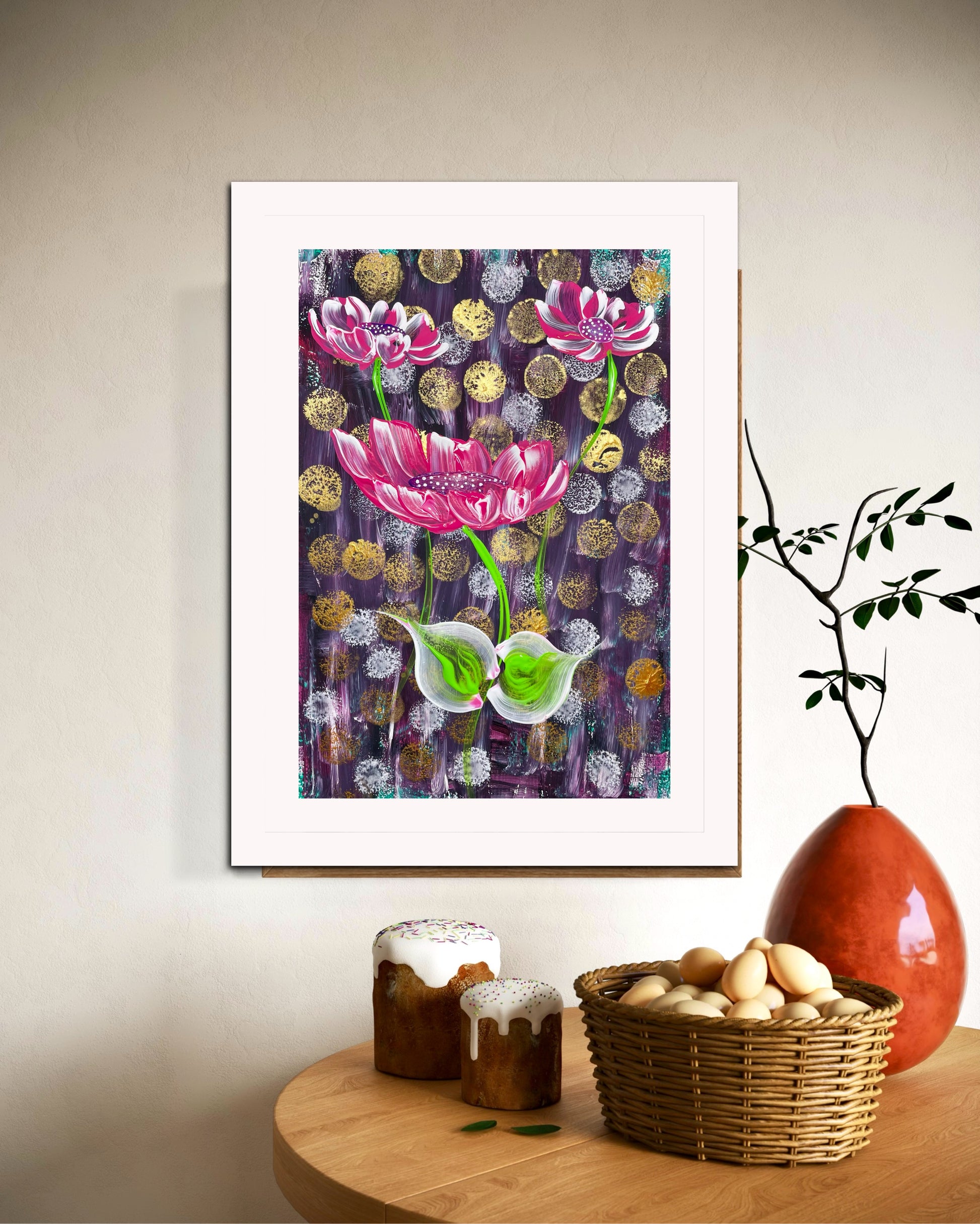 Die Inspiration für dieses Werk kam von der Vorstellung, dass Schönheit und Wachstum oft mit Herausforderungen verbunden sind. Die rosafarbenen Blüten, die sich gegen den dunklen Hintergrund abheben, sollen Hoffnung und Transformation symbolisieren. Es spiegelt wider, dass das Leben sich selbst in schwierigen Momenten entfaltet.